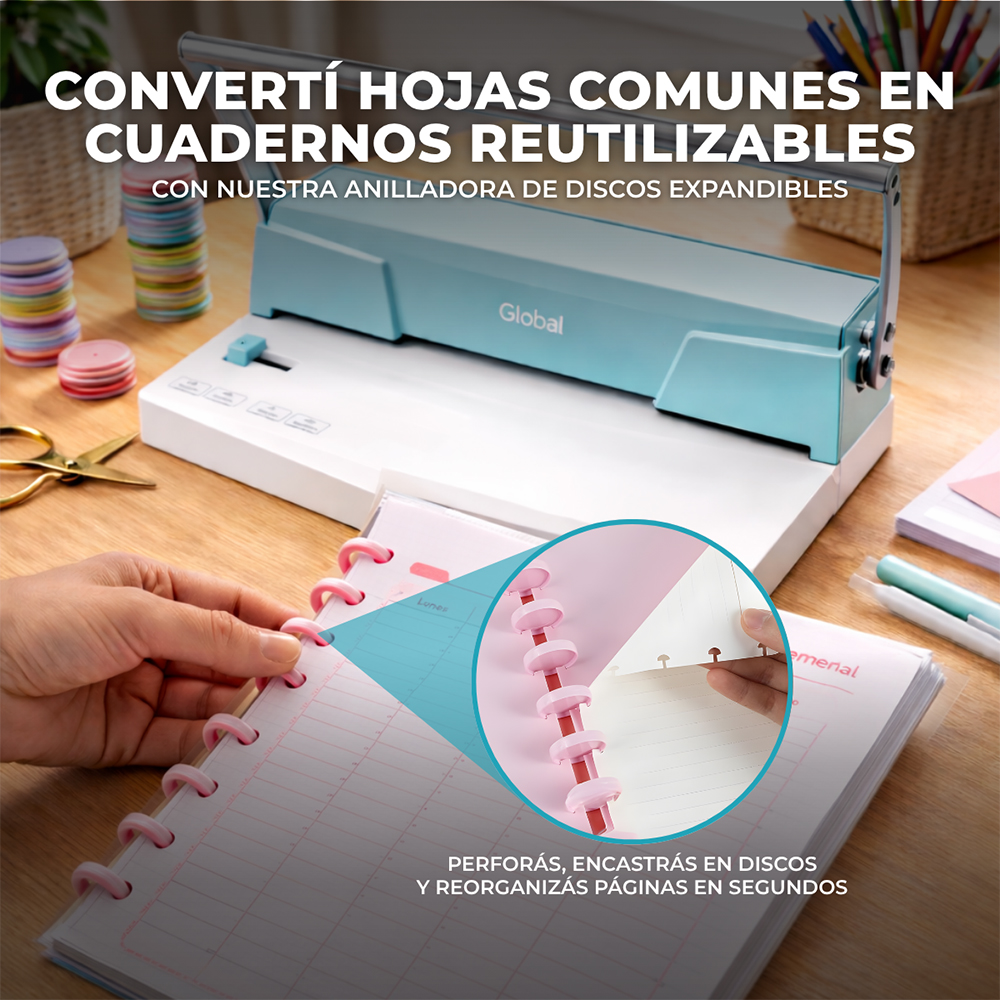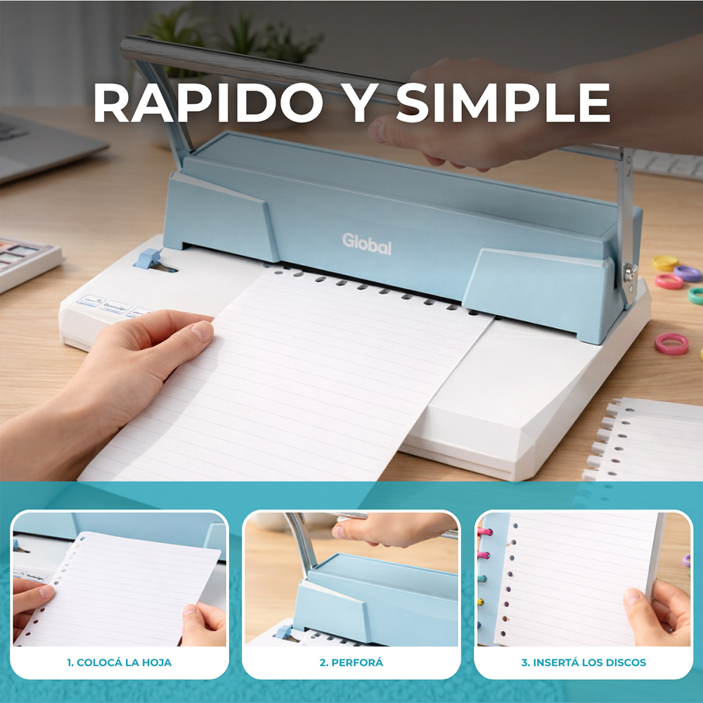 Encuadernadora Discos De Expansion Manual A4 Color Verde Agua Perfora 15 Hojas De 80 Gramos Registro Regulable
